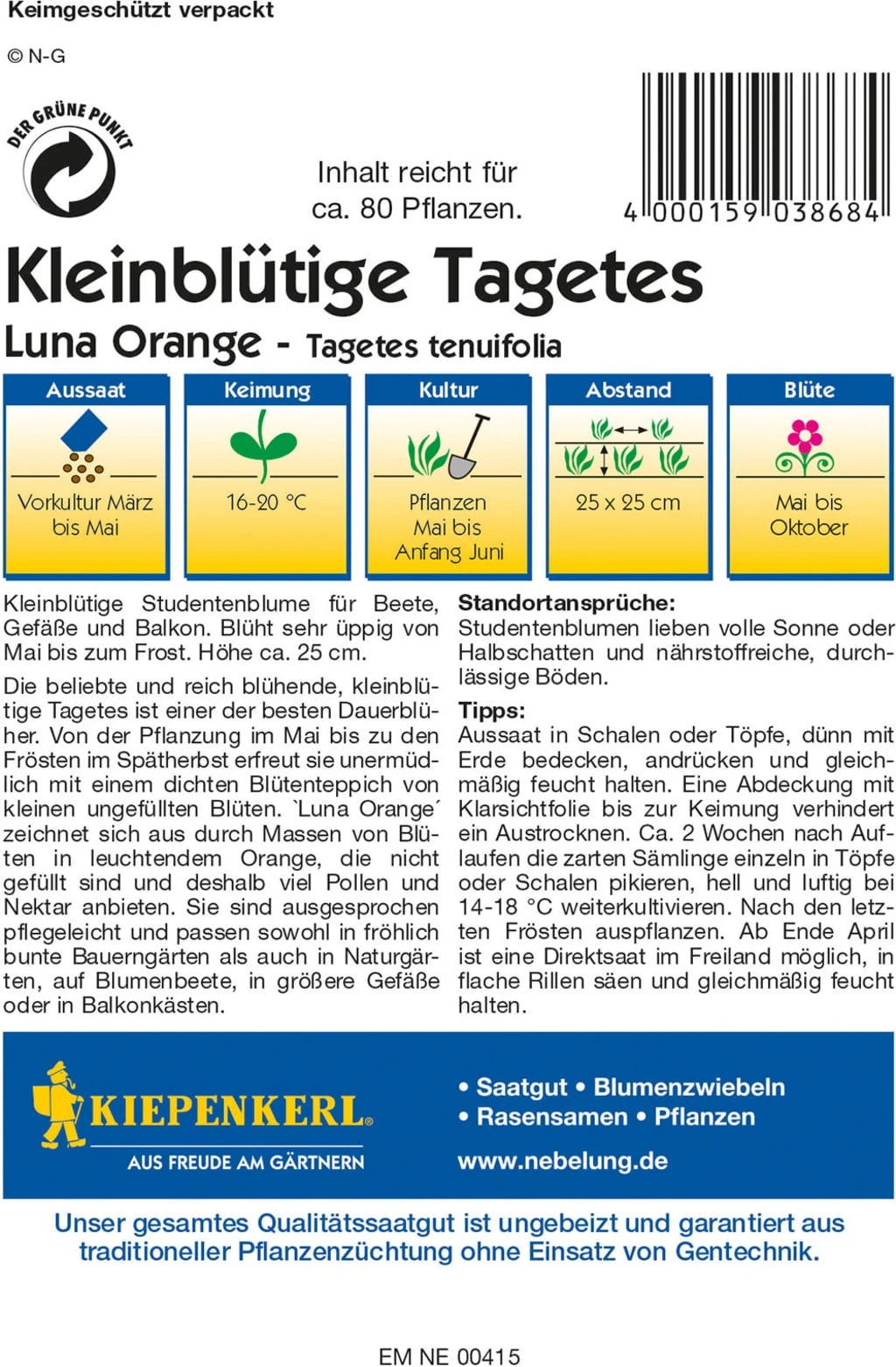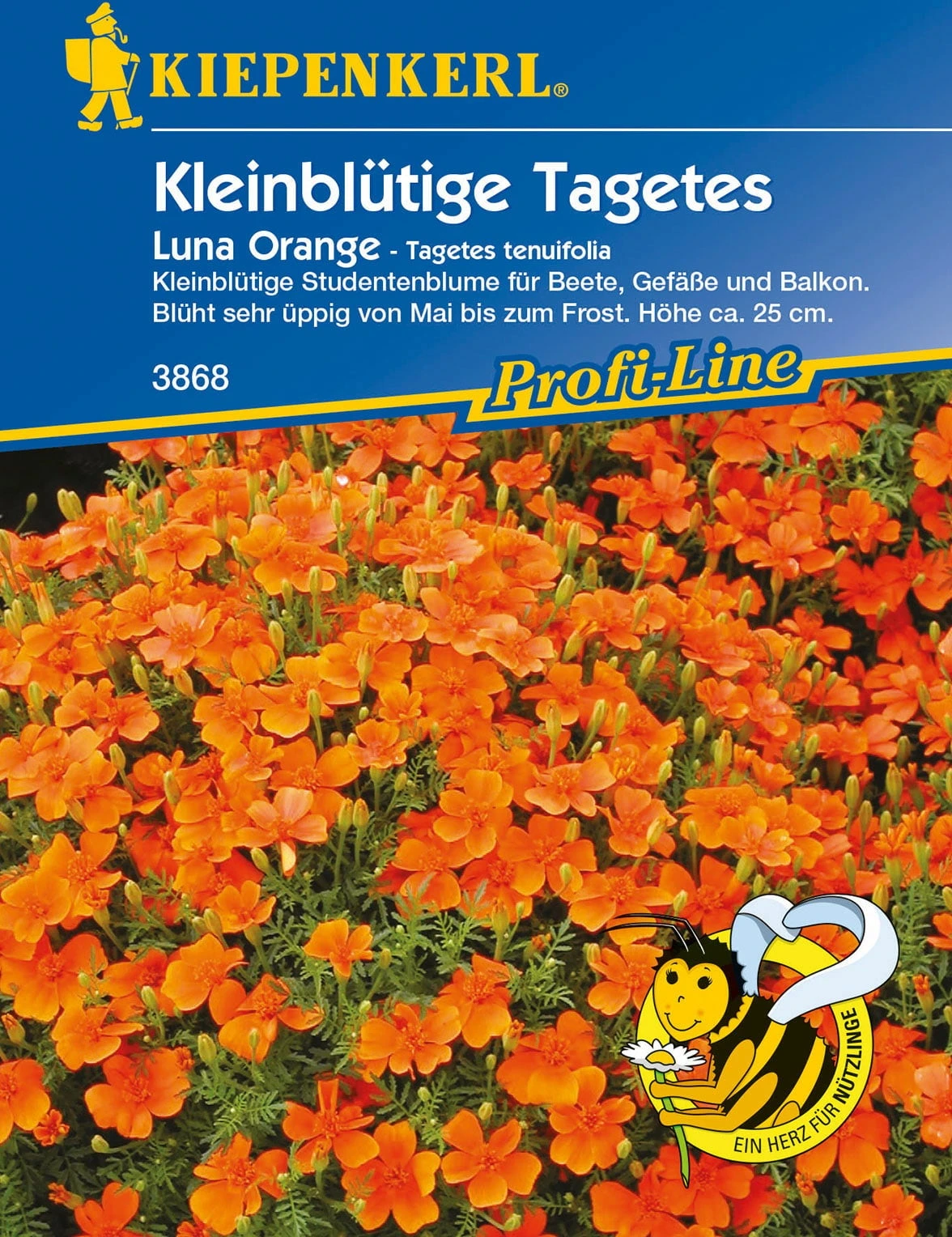 Eine sehr reich und ausdauernd blühende, kleinblütige Tagetes. Die orangen Blüten leuchten besonders intensiv. Bei flächiger Pflanzung kann ein dichter Blütenteppich entstehen.