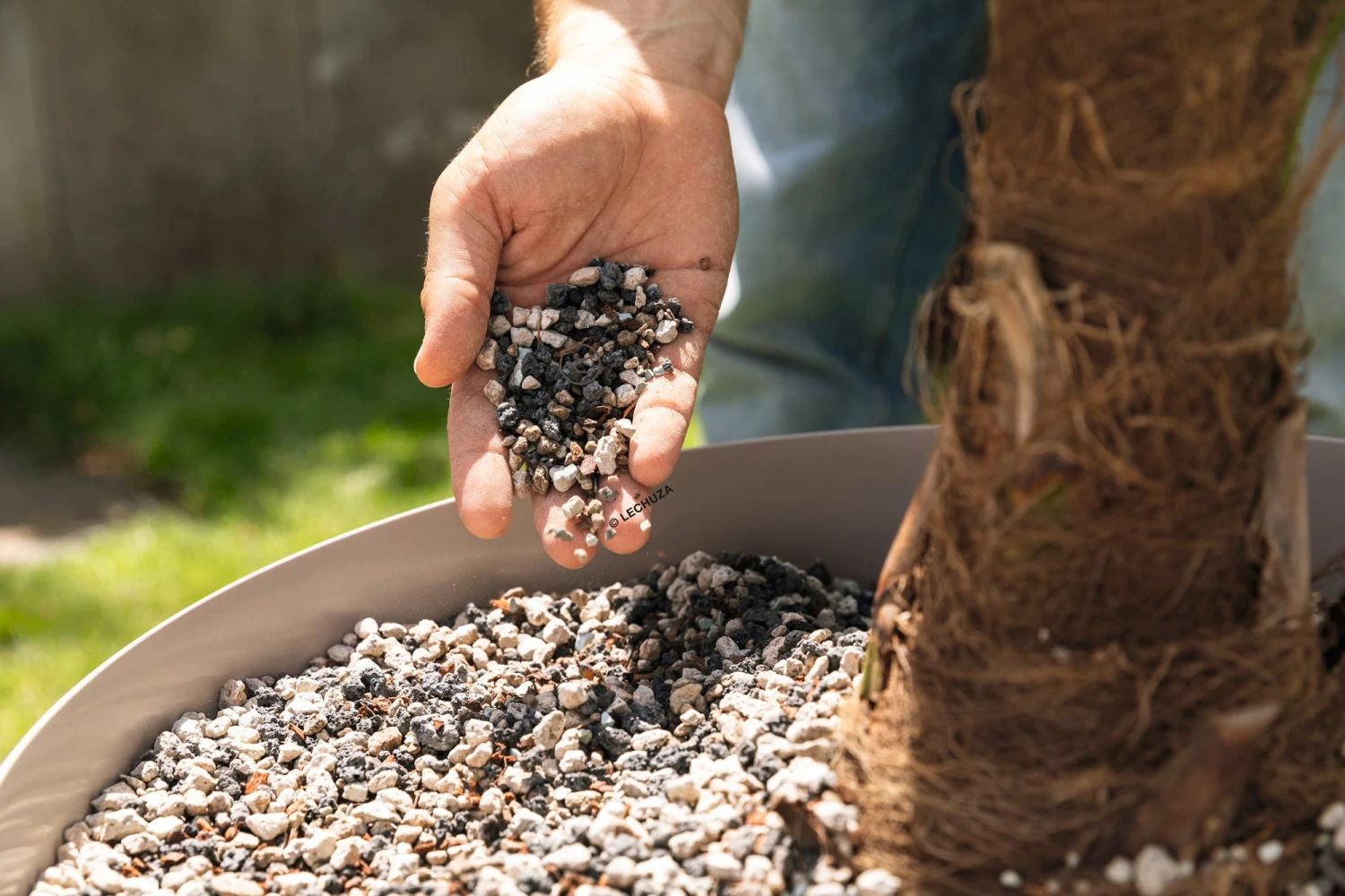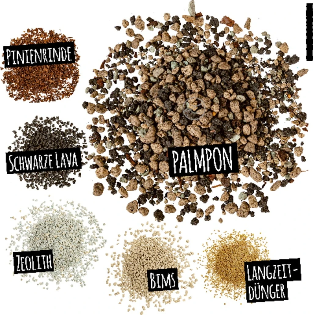 Zusammensetzung: Gestein (Bims, schwarze Lava), Zeolith, Pinienrinde, Düngemittel (speziell für Palmen)