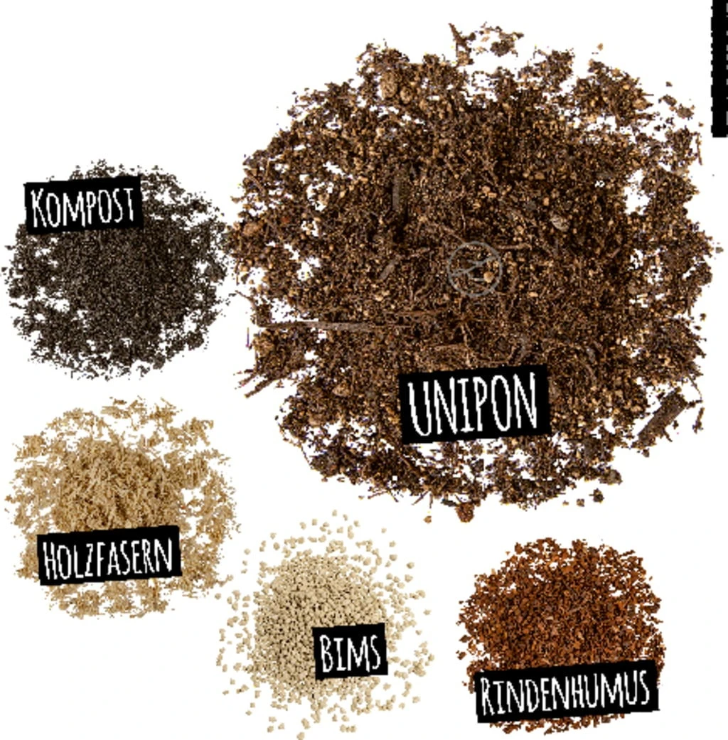 Zusammensetzung: Holzschnitzel, Holzfasern, Kompost, mineralische Anteile aus Bims, Spezialdünger für Außenpflanzen