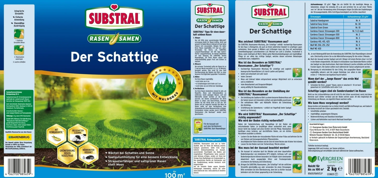 - Bringen Sie Substral Rasensamen „Der Schattige“ mit der seitlichen und integrierten Streuhilfe gleichmäßig aus. Es können auch Streugeräte wie Substral Handy Green oder Substral Easy Green verwendet werden. Bitte vermeiden Sie eine Überdosierung, denn bei zu dichter Aussaat behindern sich die Gräser gegenseitig in der Entwicklung. Die Aufwandmenge liegt bei 20g/m². Bei Verwendung eines Streugerätes folgen Sie bitte den Empfehlungen der Streuwagentabelle. (Substral Handy Green Einstellung Nr. 4, Substral Easy Green Einstellung Nr. 30)