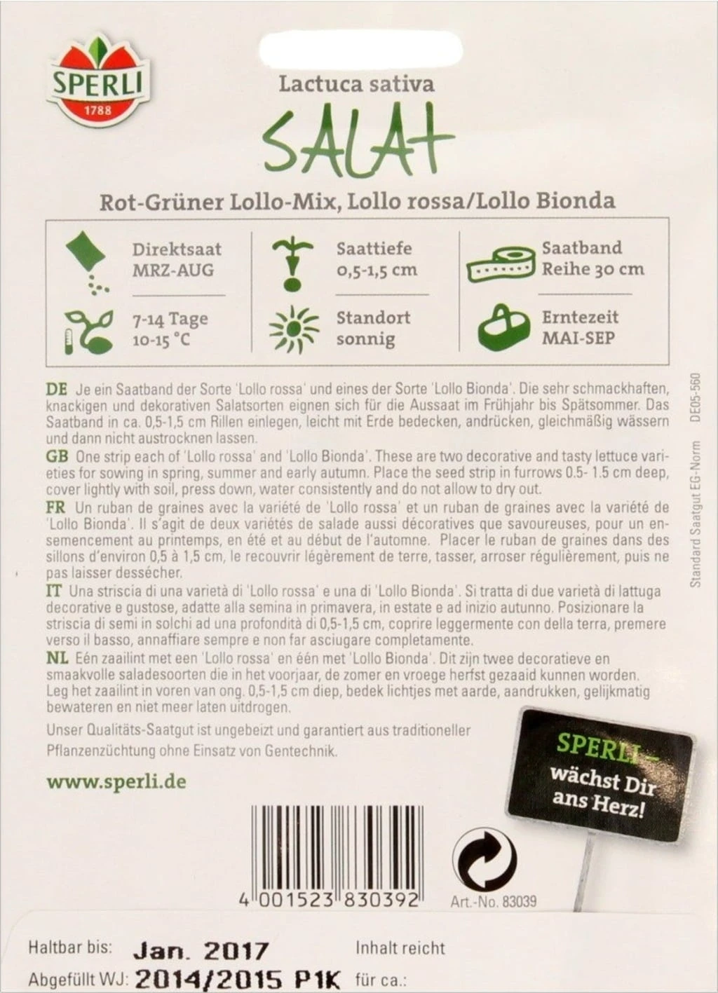 Beinhaltet je ein Saatband der Sorte Lollo rossa und eines der Sorte Lollo Bionda. Die sehr schmackhaften, knackigen und dekorativen Salatsorten eignen sich für die Aussaat im Frühjahr bis Spätsommer.