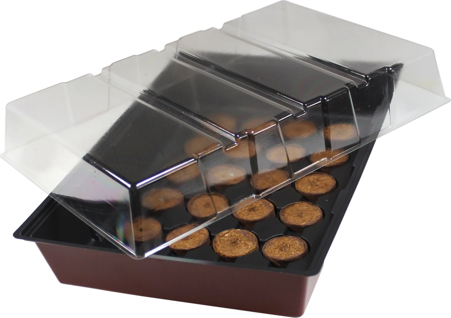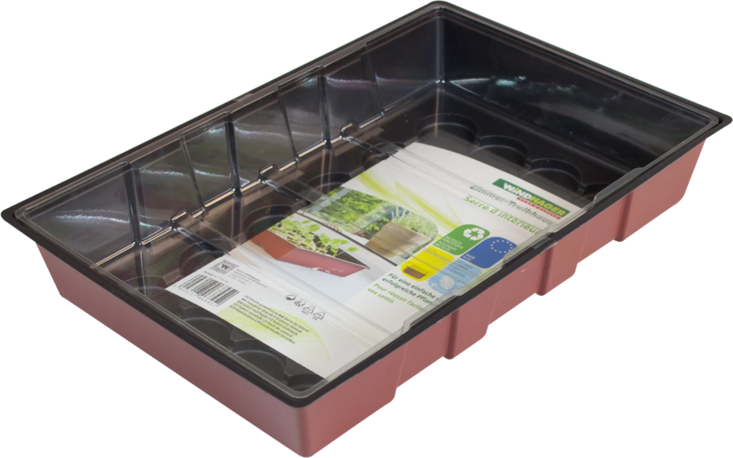 Die terracotta-farbige, robuste Kunststoffschale mit Klarsichthaube sorgt für ein Treibhausklima in dem Keimlinge zeitiger und besser gedeihen, mit oder ohne Anzucht-Quelltabs.